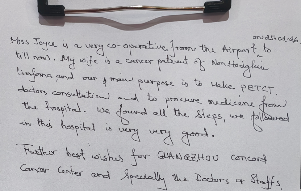 One early morning in March 2026,shortly after 4:30 am., Guangzhou was still enshrouded in darkness. Joyce from the Customer Service Department of Guangzhou Concord Cancer Center(GCCC) had already quietly set out to meet a married couple from afar and were staying at their hotel —— Ms. M, a Bangladeshi patient, and her husband, who were about to catch an early flight back home. This was no ordinary airport send-off, but a warm interlude in a medical journey spanning over 2,000 kilometers.