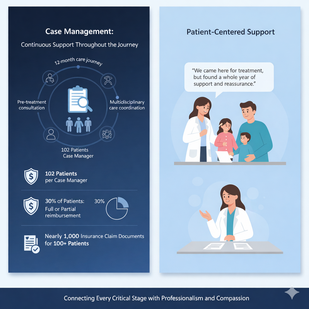 Each case manager supports an average of 102 patients over a comprehensive 12-month care journey, encompassing pre-treatment consultation, multidisciplinary care coordination, and post-treatment follow-up, connecting every critical stage with professionalism and compassion.