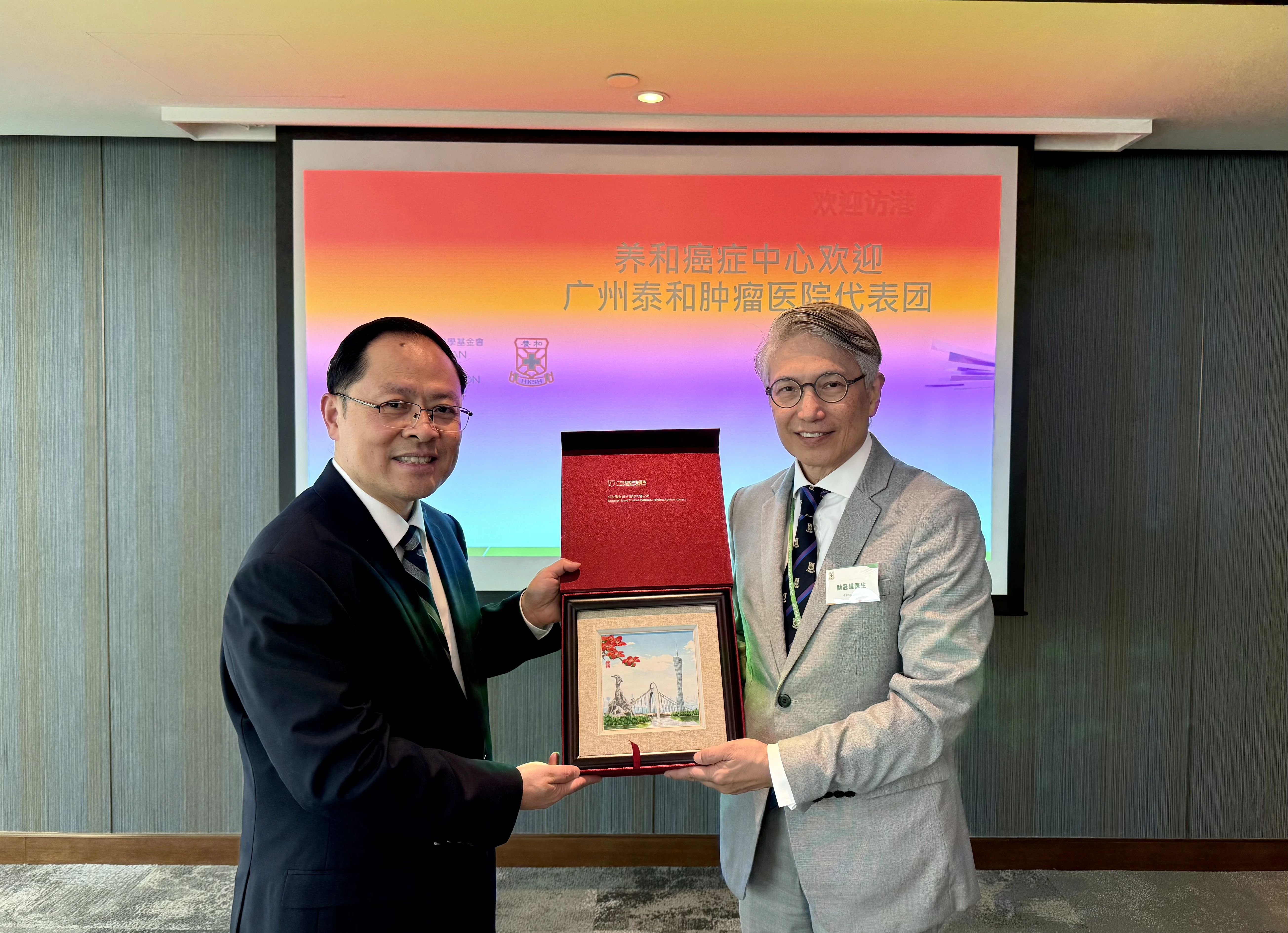 Dr. Leo Kwan-hung, Vice President of Hong Kong Sanatorium & Hospital, received a gift from Guangzhou Concord Cancer Center on behalf of the hospital.